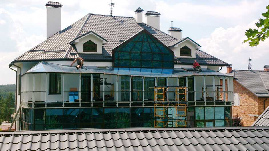 Это уникальный проект в котором было решено сразу несколько задач: увеличение жилой площади, визуальное объединение фасада здания в одну архитектурную конструкцию, защита террасы от осадков. Достижение полной гидроизоляции в самонесущей алюминиевой конструкции.